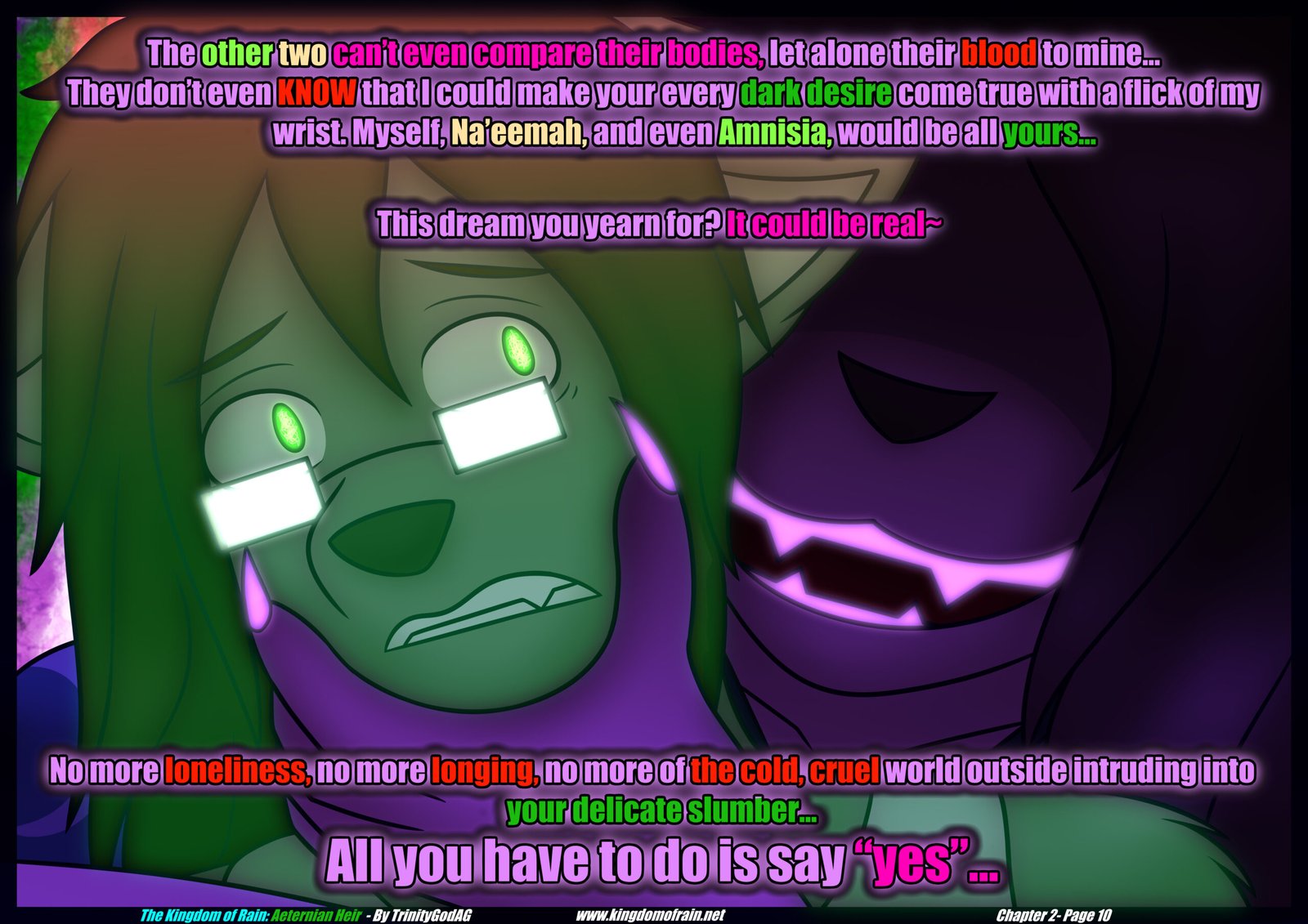 Lexi: “The other two can’t even compare their bodies, let alone their blood to mine… They don’t even KNOW that I could make your every dark desire come true with a flick of my wrist. Myself, Na’eeemah, and even Amnisia, would be all yours… This dream you yearn for? It could be real~ No more loneliness, no more longing, no more of the cold, cruel world outside intruding into your delicate slumber. All you have to do is say “yes”…”